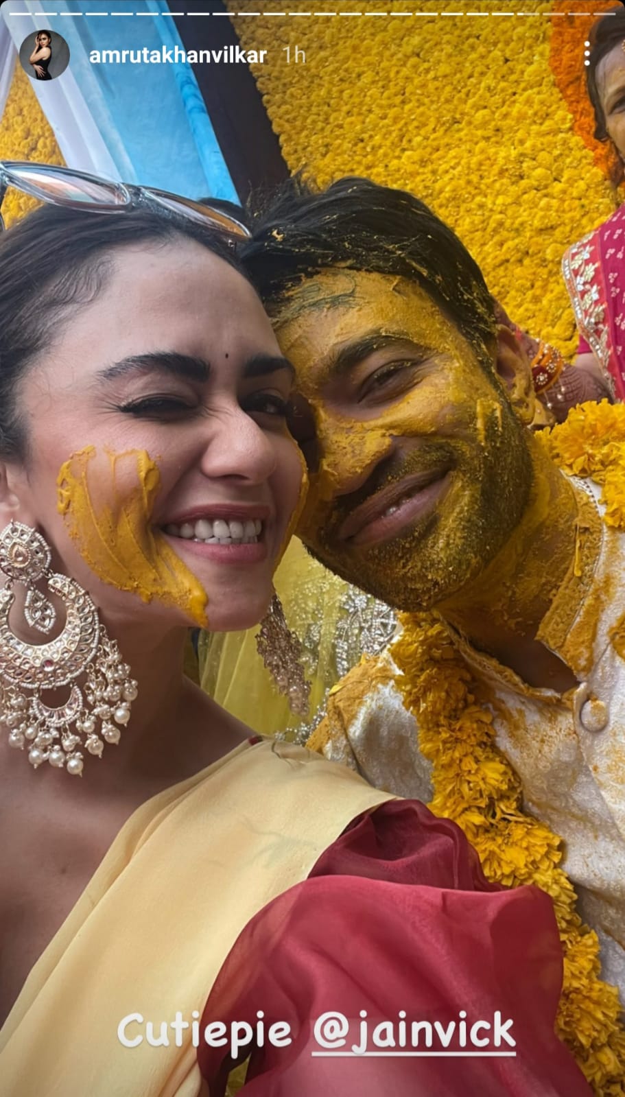Their friend Amruta Khanvilkar, another popular Television actress, took to her Instagram stories and participated in filmland and videotape from the form. Amruta posed with Vicky and Ankita both in the filmland and was also seen applying Haldi on Ankita Lokhande's face. She called Ankita" meet the bridegroom" and Vicky "Cutiepie".